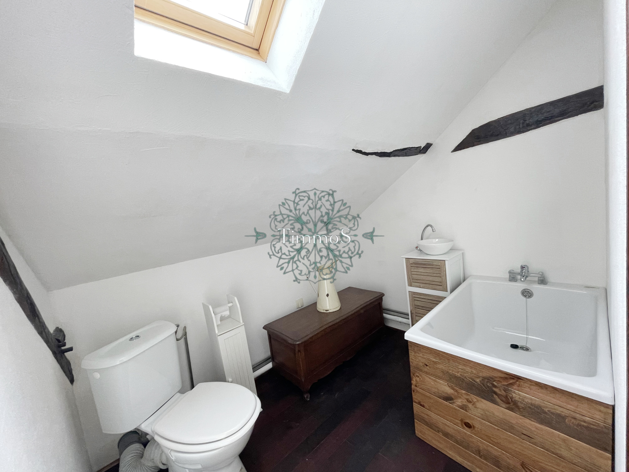 Découvrez une cuisine conviviale avec cheminée décorative et un séjour chaleureux avec cheminée insert. La maison offre deux chambres, dont une suite parentale avec salle de bain privative. Un espace bureau lumineux sous les combles, ainsi qu'une deuxième salle de bain avec baignoire sabot, complètent l'ensemble.